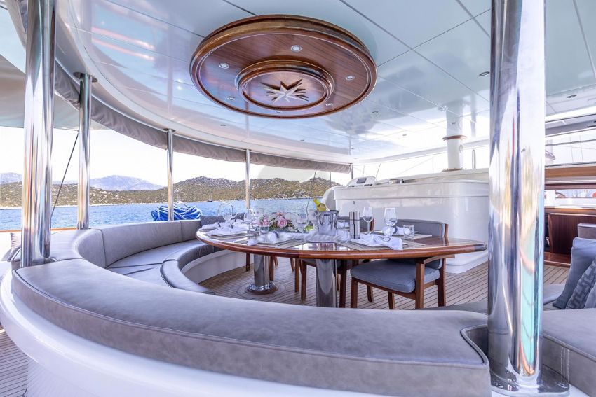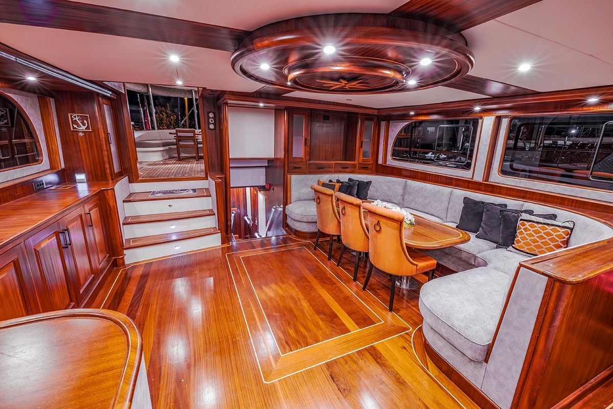 Geniş güvertesi, konforlu oturma alanları ve panoramik manzaralı salonu ile Aqua Bella, deniz üzerinde huzurlu bir atmosfer yaratır. İç salonda Smart TV, Bluetooth müzik sistemi ve farklı kahve seçenekleri sunan makineler yer alır.