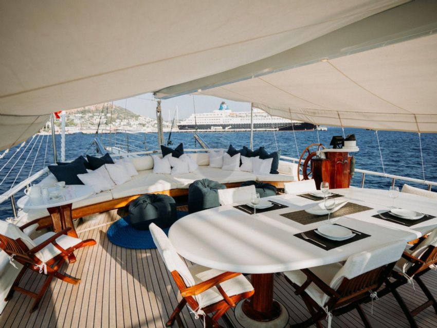 Dış mekanlarda ise geniş güverte alanı, güneşlenme, dinlenme veya açık havada yemek yeme imkanı sunar. Gölgelikli arka güverte, rahat yemekler veya akşam kokteylleri için idealdir.