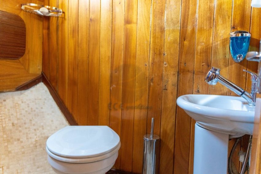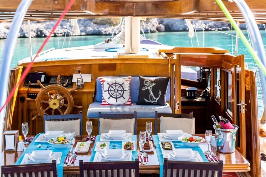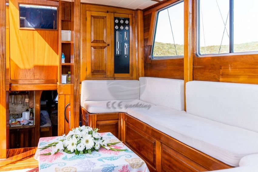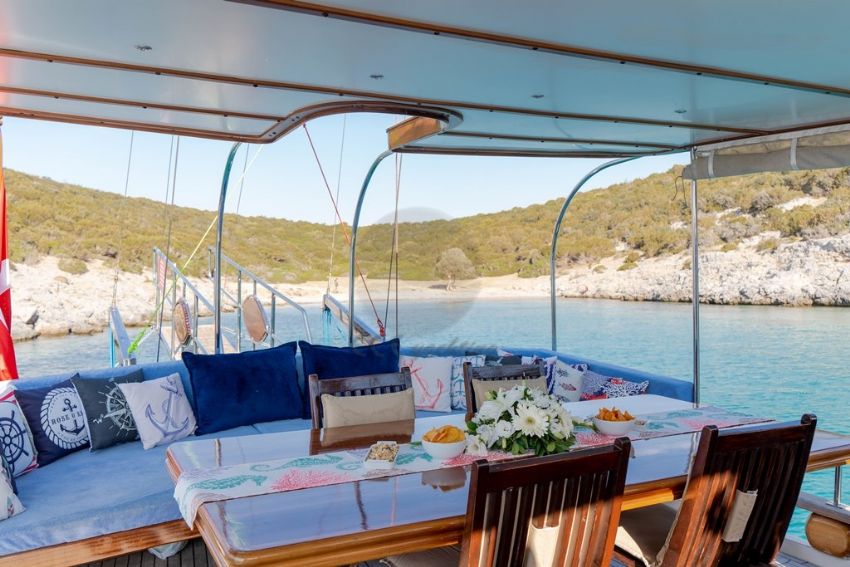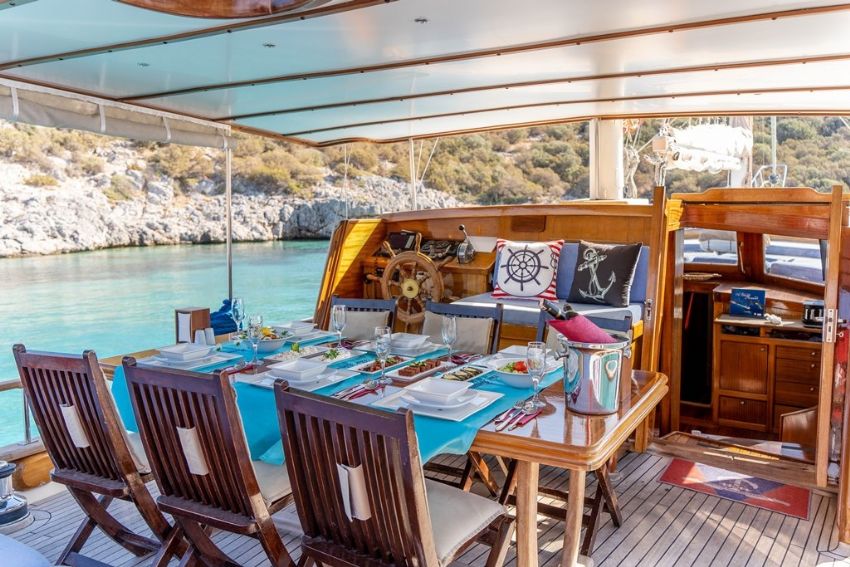 Guletin arka kısmında geniş ve rahat bir oturma alanı, yemek masası ve keyifli yemek alanı bulunmaktadır. Ayrıca, salon içinde ayrı bir yemek masası ve tam donanımlı bir mutfak mevcuttur. Güneşlenmek isteyen misafirler için yeterli sayıda güneşlenme minderi ve geniş bir güverte alanı sunulmaktadır.