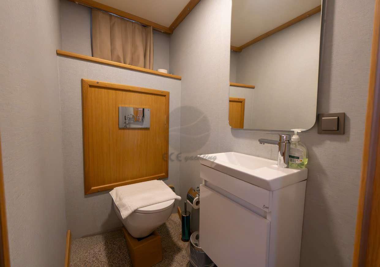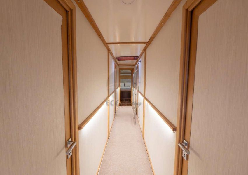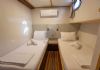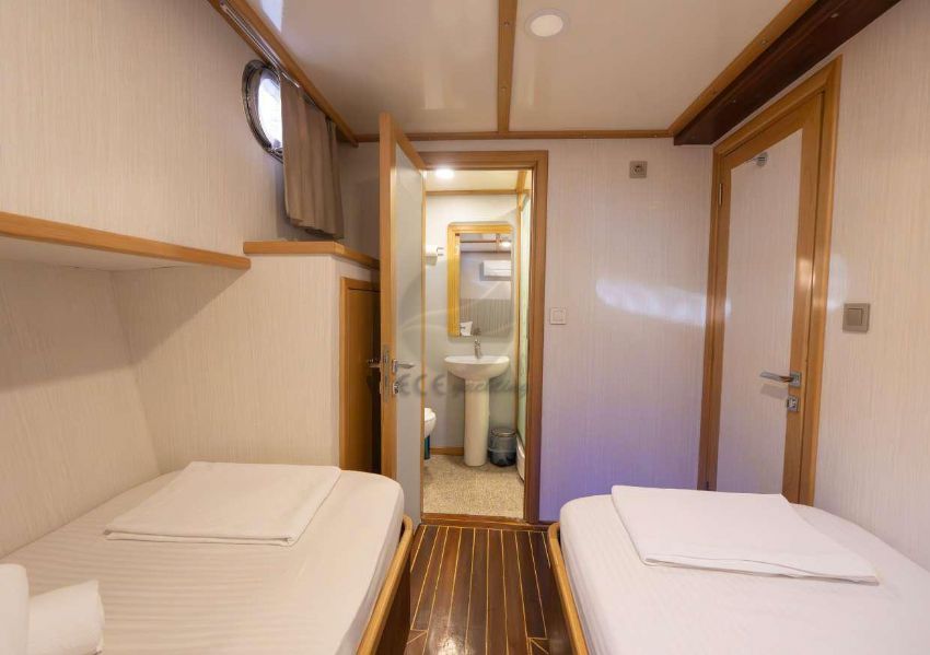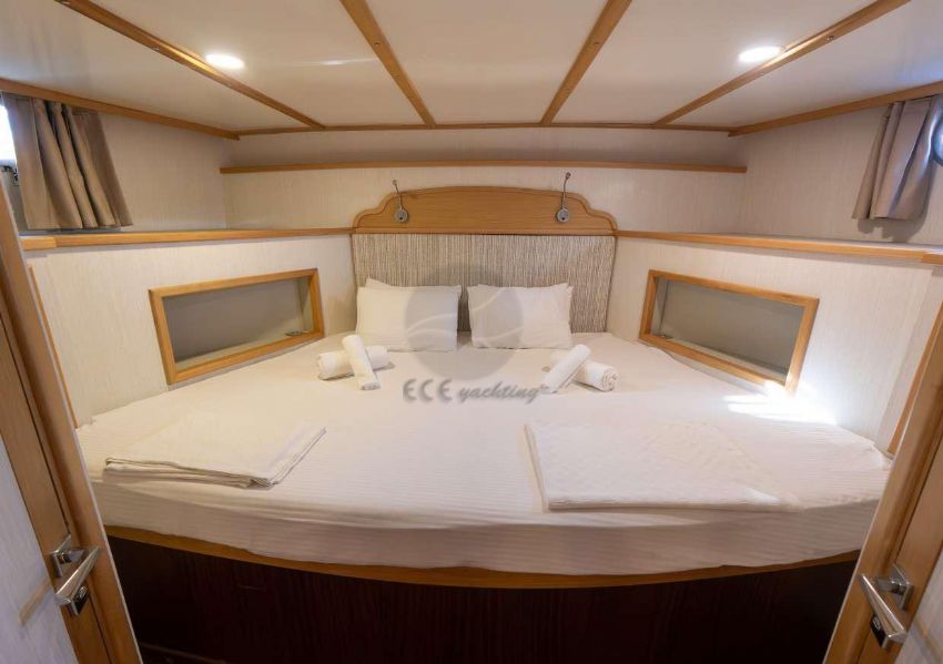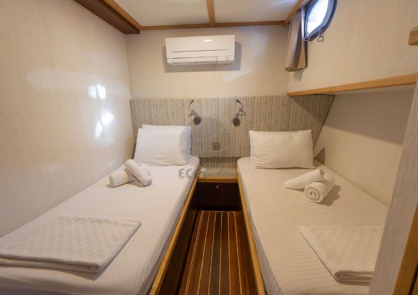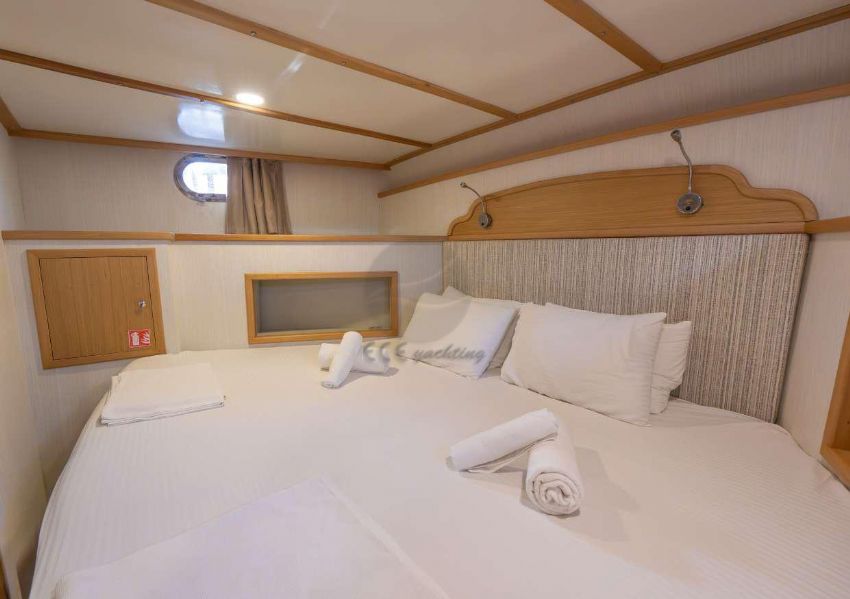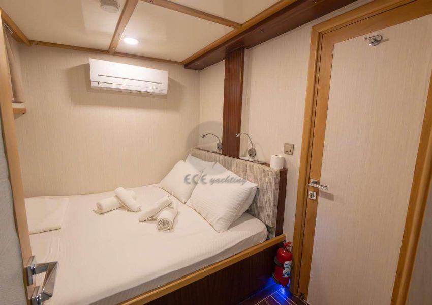 Toplam 5 kabin (1 Master, 2 Double ve 2 Twin) ile 10 kişiye kadar konaklama imkânı sağlar. Her kabinde ve salonda klima bulunur. 4 kişilik deneyimli mürettebat, konuklara seyir boyunca eksiksiz ve güler yüzlü hizmet sunar.