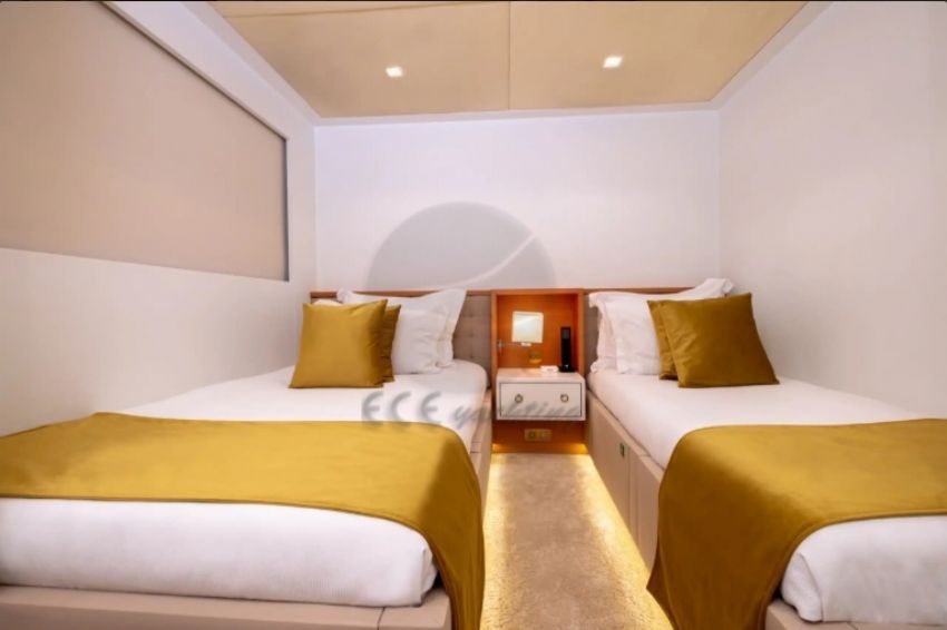 sunarken, geniş ve lüks bir VIP kabin, iki adet çift kişilik kabin ve bir ikiz