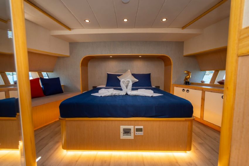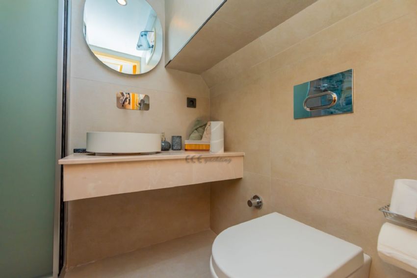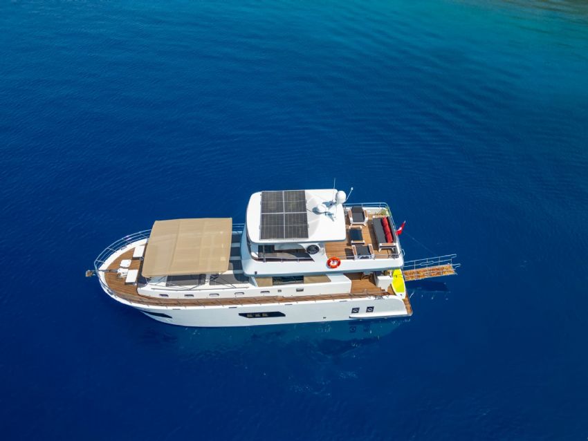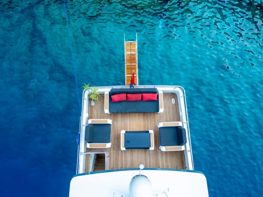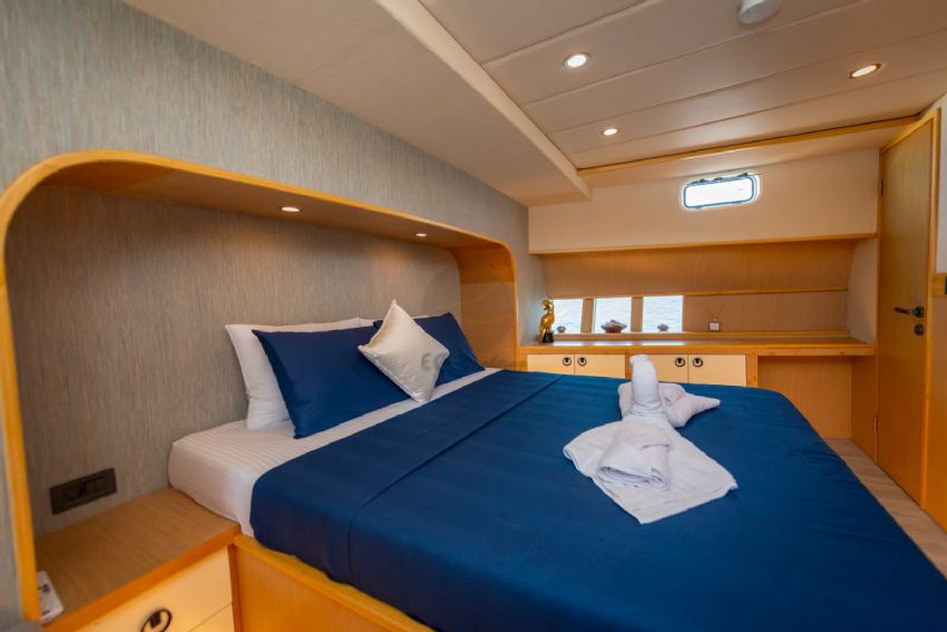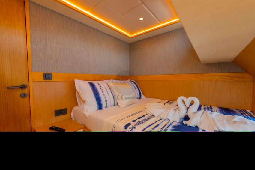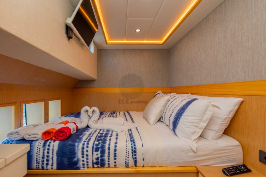 2024 yapımı ve 18 metre boyundaki 3 kabinli teknemiz, 6 kişiye kadar konaklama imkanı sağlamaktadır. Birbirinden şık, modern döşenmiş kabinler teknenin baş altındaki kısımda bir baş master ve 2 double kabin şeklindedir. Aydınlık ve ferah döşemesi ile dikkat çeken her kabinde banyo -WC bulunmaktadır. Ayrıca, ayrı mürettebat kabini de mevcuttur. Teknemiz Göcek limanına kayıtlı olmakla birlikte Göcek veya Fethiye limanından hareketle, 3 kişilik güler yüzlü ve tecrübeli mürettebatıyla küçük aile ve gruplara hizmet vermektedir. İnternet, TV, kano, su oyuncakları gibi olanaklar sunulan teknemizde konforlu bir tekne tatili yapabileceğinizi Ece Yatçılık olarak garanti ediyoruz.