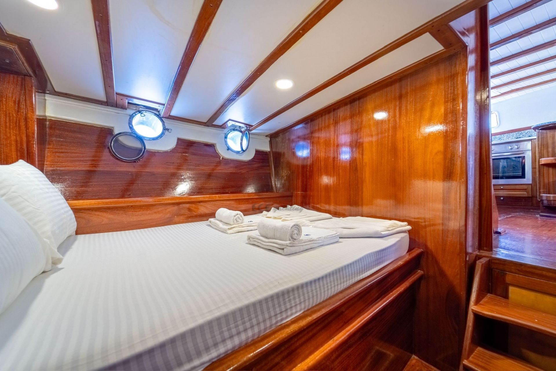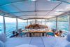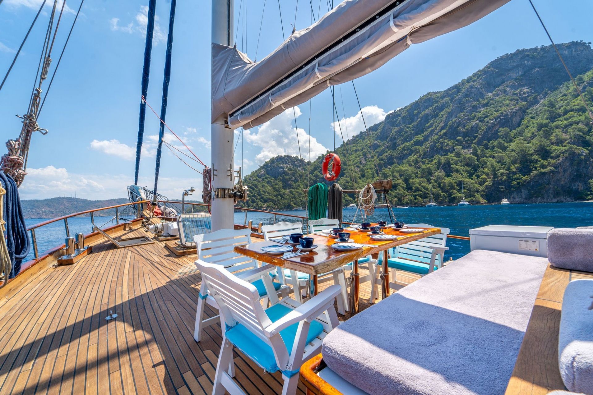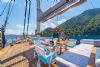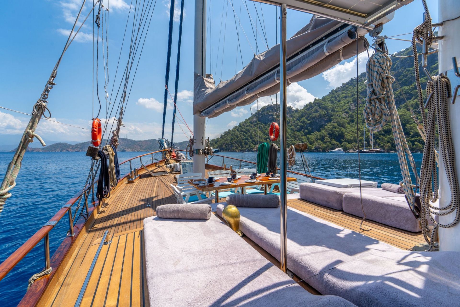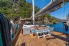 Geniş güverte alanlarında her misafir için ayrı güneşlenme minderleri, ön ve arka güvertede rahat oturma alanları sunulmaktadır. Tam donanımlı mutfakta granit tezgah, buzdolabı, derin dondurucu, fırın ve bulaşık makinesi gibi ekipmanlar yer alırken; müzik sistemi ve TV ile keyifli vakit geçirebilirsiniz.