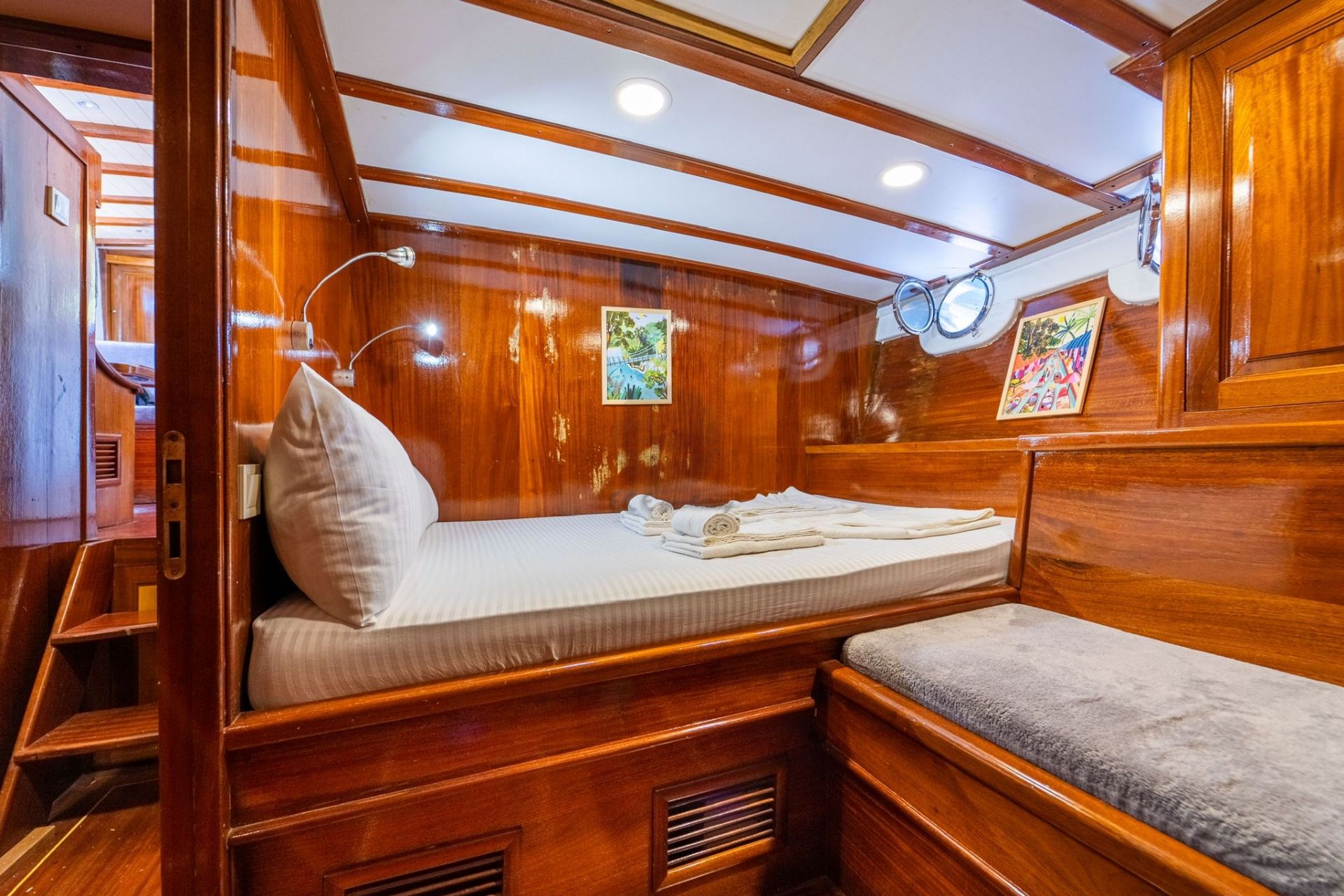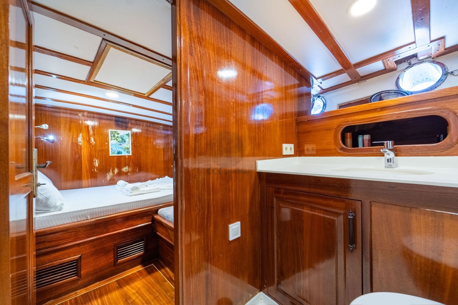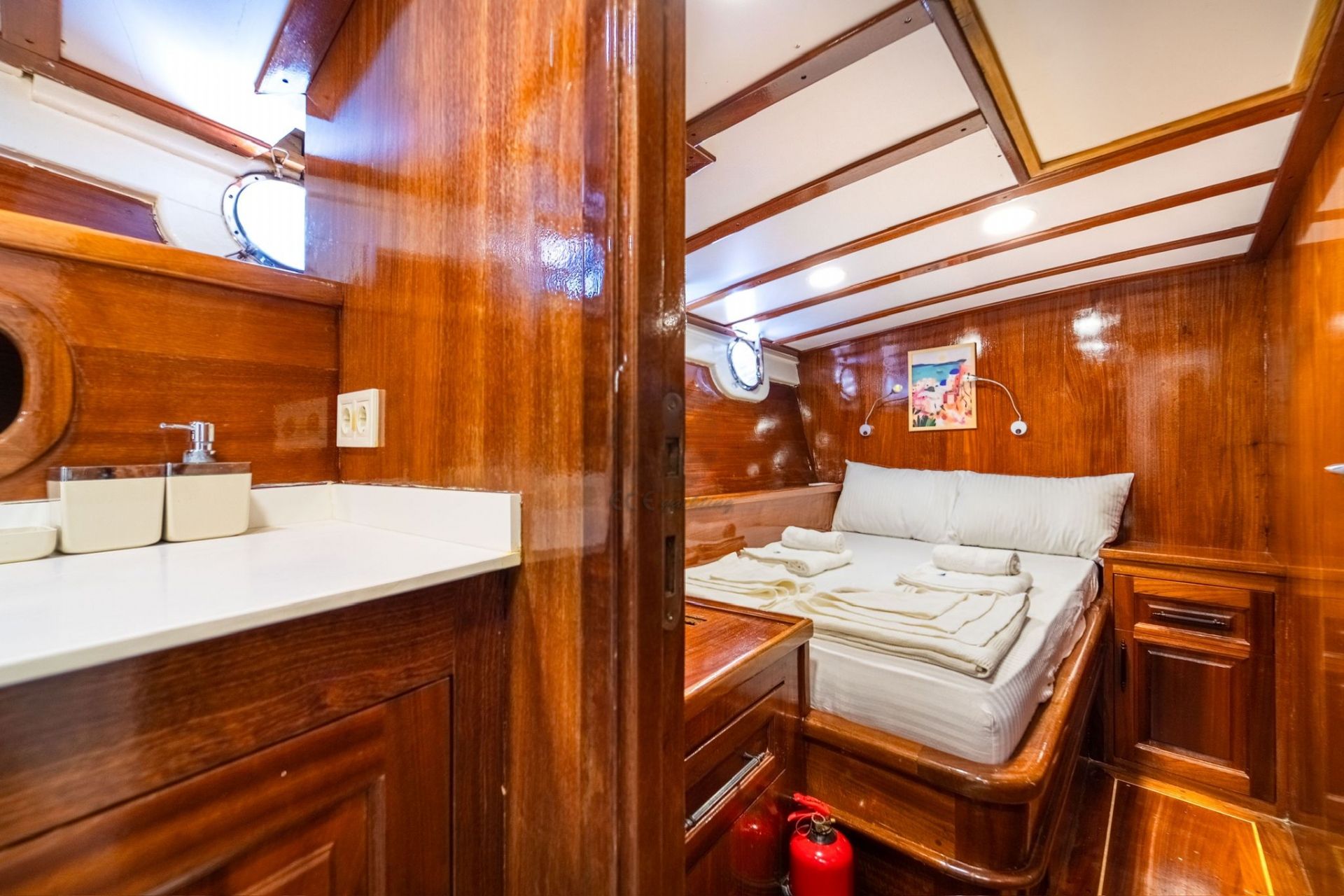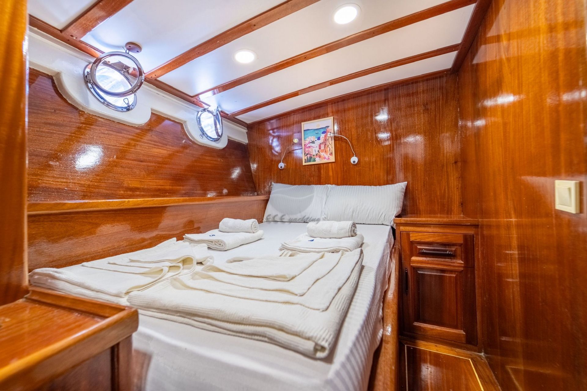 Toplam 3 kabin ile 6 misafire kadar konaklama kapasitesi sunan teknede, her kabinde özel banyo (duşakabin & WC), elbise dolabı ve saç kurutma makinesi bulunmaktadır. Tüm kabinlerde klima yer almakta olup, sıcak yaz günlerinde konforlu bir ortam sağlar.