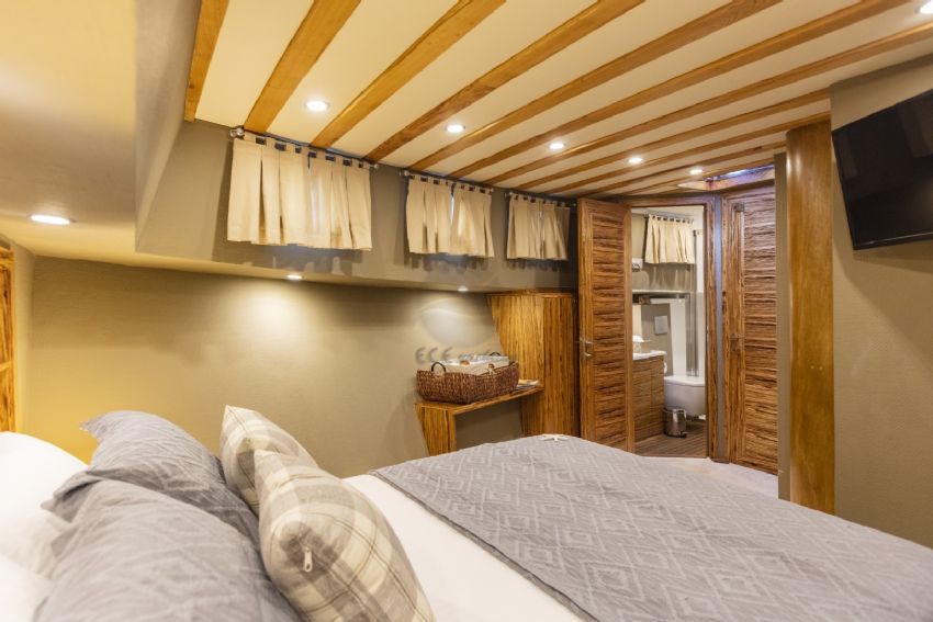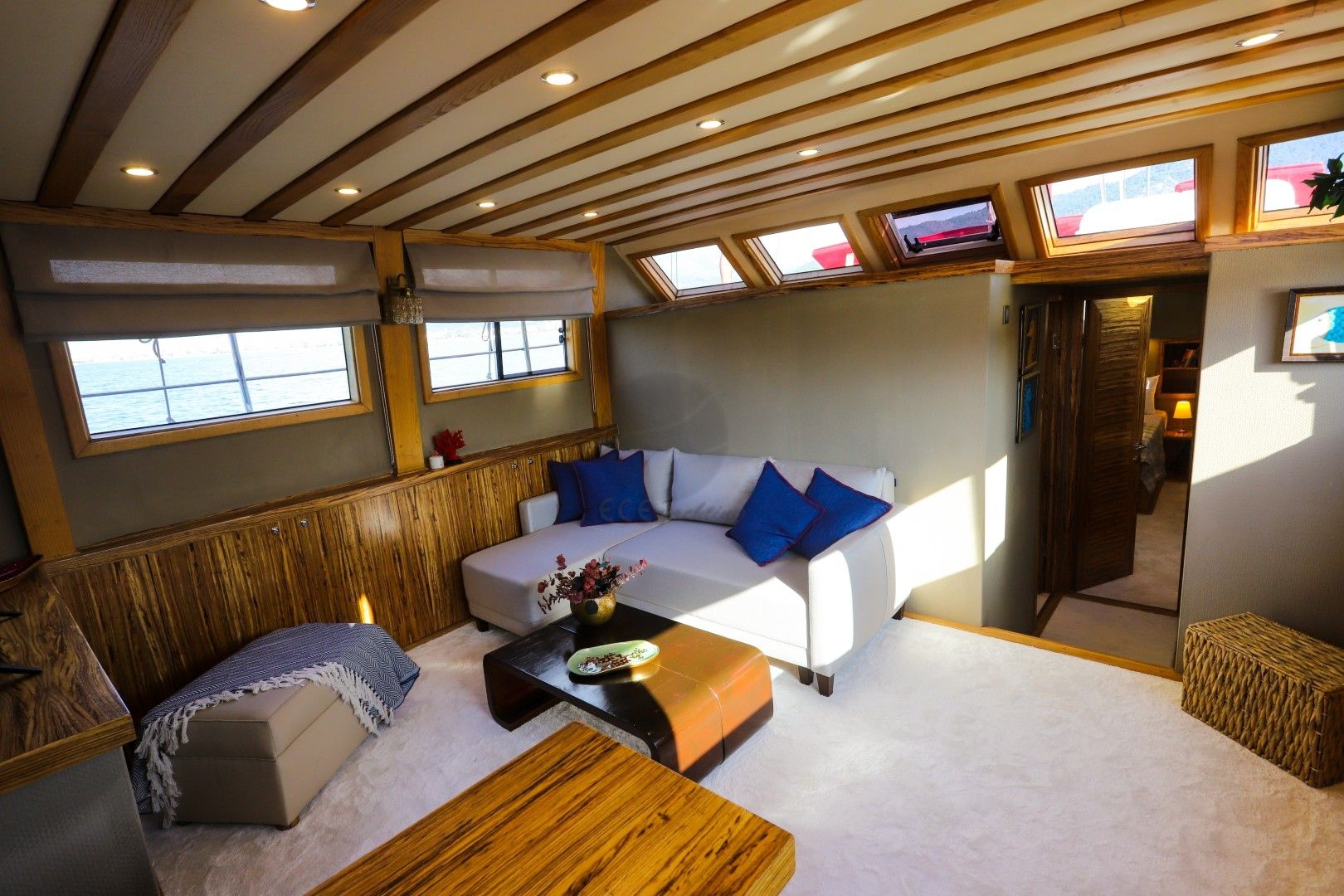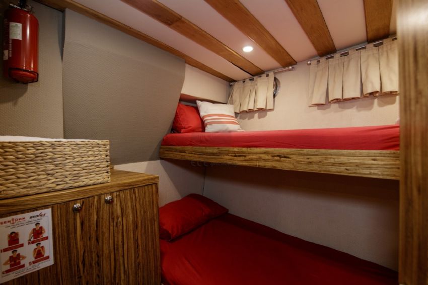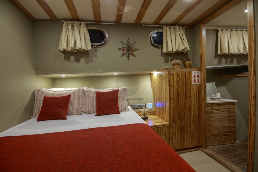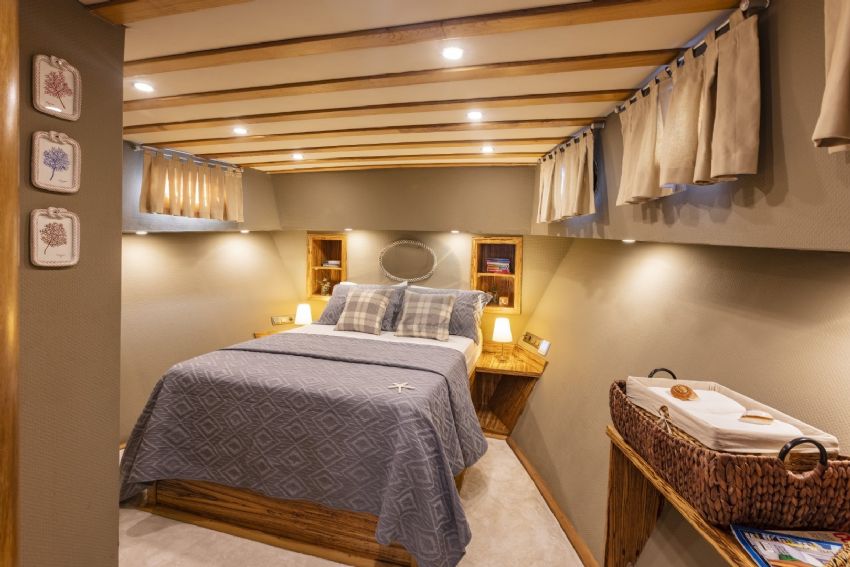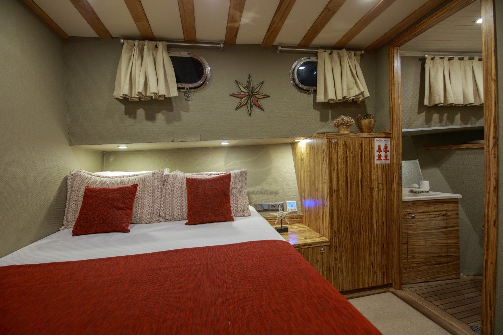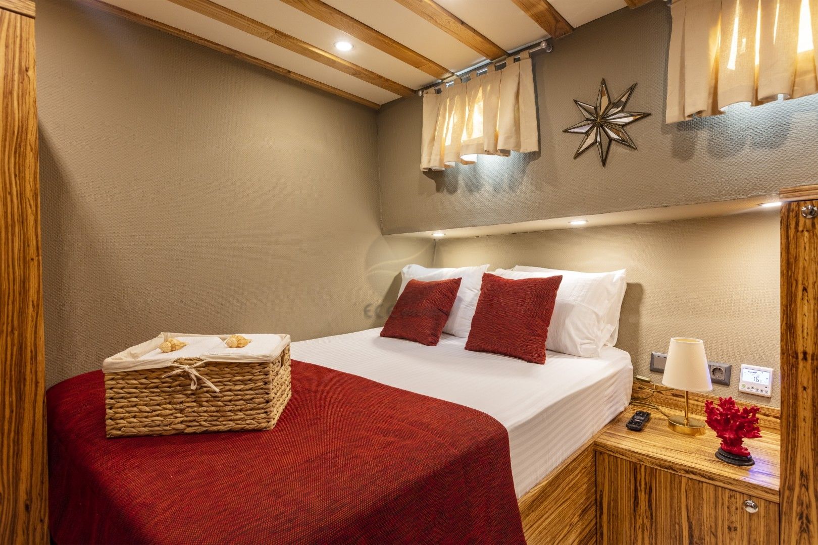 Toplam 3 kabin (1 Master, 1 VIP ve 1 ranzalı twin) ile 6 kişiye kadar konaklama kapasitesi sunan teknede, her kabin özel banyosu ile donatılmıştır. Sıcak ve davetkar iç mekânları, misafirlerine rahat bir yaşam alanı sağlar.