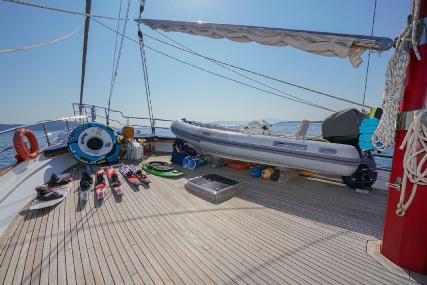 Şnorkel ekipmanları, Balık tutma malzemeleri, Güneş tenteleri, Güneş yatakları, Güvertede duş, Deniz merdiveni