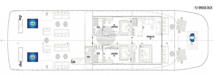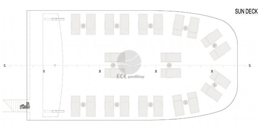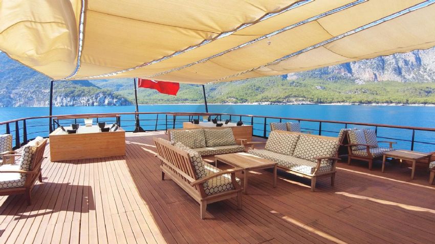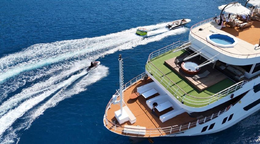 Şnorkel ekipmanları, Balık tutma malzemeleri, Güneş tenteleri, Güneş yatakları, Güvertede duş, Deniz merdiveni