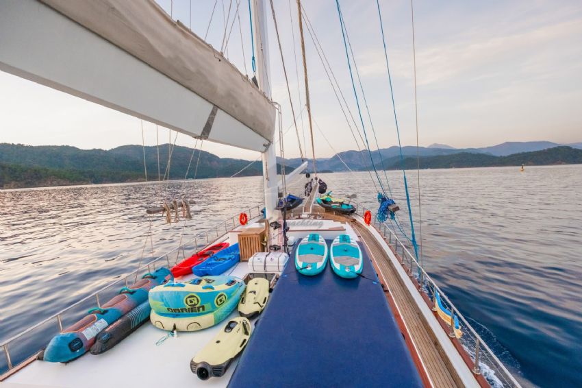 Şnorkel ekipmanları, Balık tutma malzemeleri, Güneş tenteleri, Güneş yatakları, Güvertede duş, Deniz merdiveni