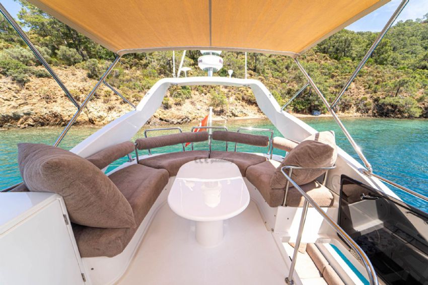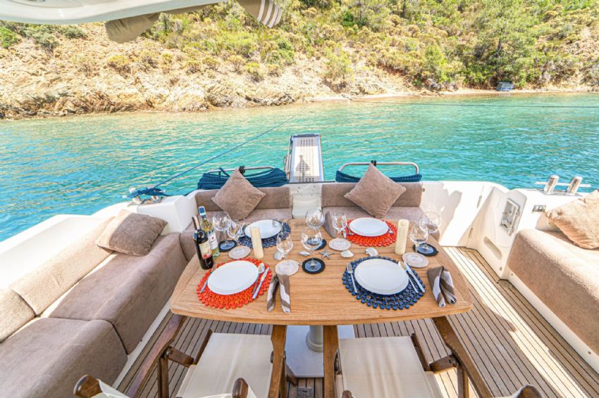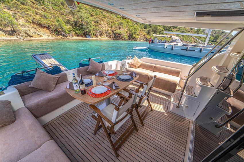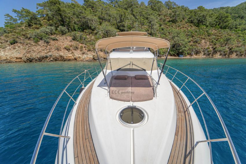 Güverte alanı, güneş tenteleri ve yatakları ile donatılmış olup, deniz merdiveni ve güverte duşu gibi olanaklar sunar. Misafirler, şnorkel ekipmanları ve balık tutma malzemeleri ile denizin tadını çıkarabilirler. My Imera, 2 kişilik deneyimli mürettebatı ile Göcek'in muhteşem koylarını ve adalarını keşfetmek isteyen misafirlerine eşsiz bir mavi yolculuk deneyimi sunmaktadır.