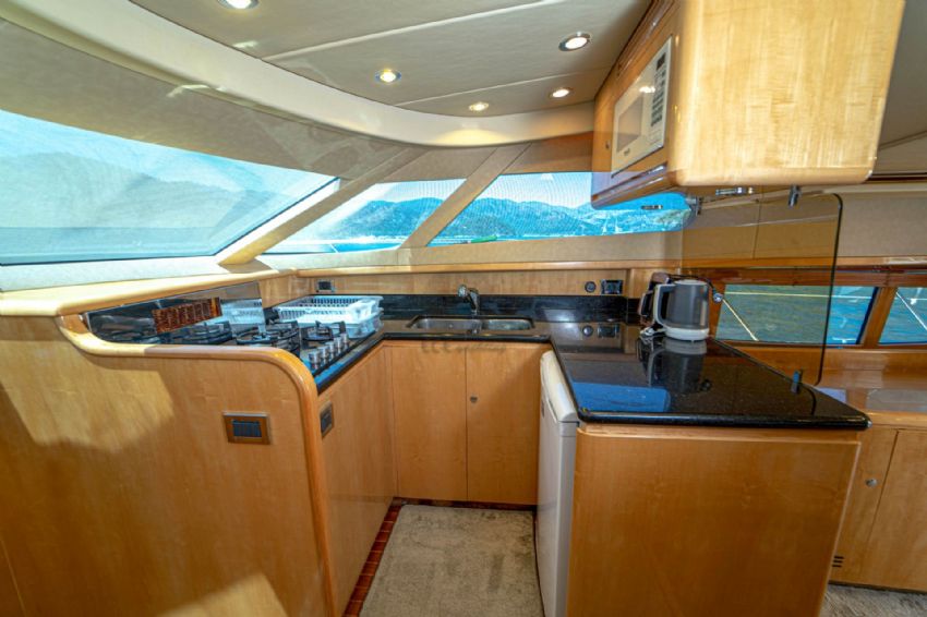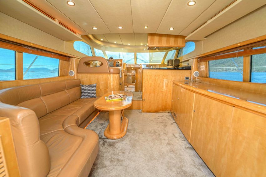 Yatın iç mekanı, tam donanımlı bir mutfak, bar, yemek masası ve rahat bir oturma alanı ile donatılmıştır. Klasik tarzda döşenmiş salonu, misafirlerine ev konforu sunar. Elektronik sistemler arasında haberleşme cihazı, derinlik ölçer, radar, GPS, pusula, uydu haberleşme cihazı, otomatik pilot ve elektronik harita bulunmaktadır. Ayrıca, DVD oynatıcı, kahve makinesi, Bluetooth müzik bağlantısı, tavla, iskambil ve saç kurutma makinesi gibi ekstra olanaklar da mevcuttur.