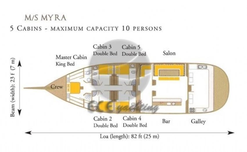 Dalış malzemeleri, Balık tutma malzemeleri, Güneş tenteleri, Güneş yatakları, Güvertede duş, Deniz merdiveni