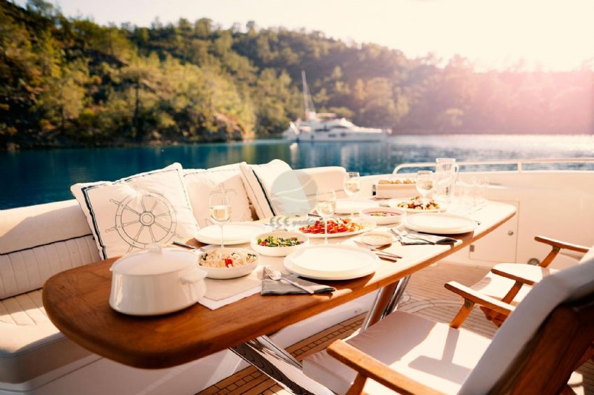 Şnorkel ekipmanları, Balık tutma malzemeleri, Güneş tenteleri, Güneş yatakları, Güvertede duş, Deniz merdiveni