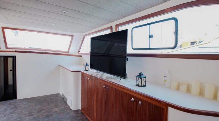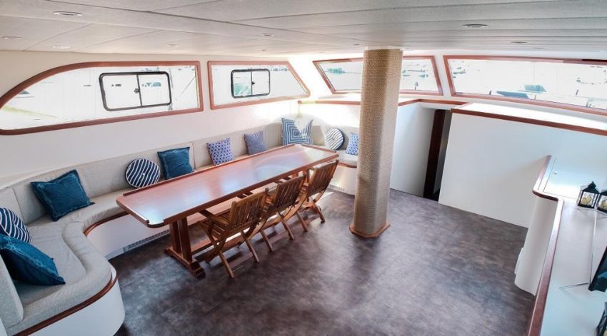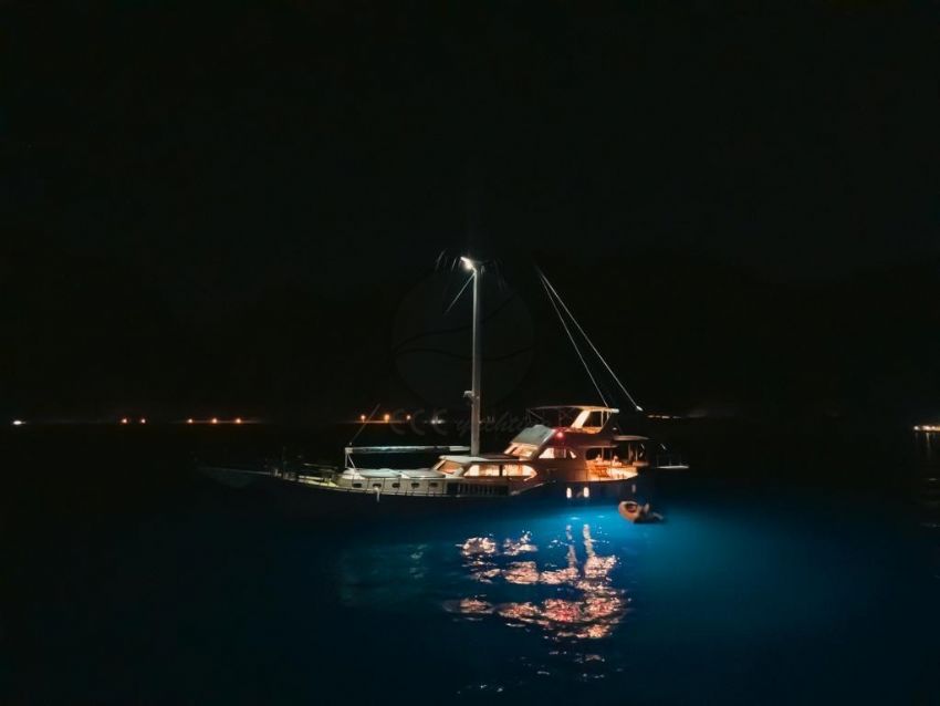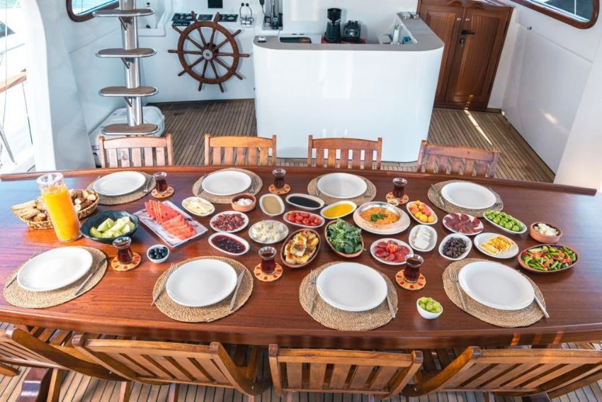 Şnorkel ekipmanları, Balık tutma malzemeleri, Güneş tenteleri, Güneş yatakları, Güvertede duş, Deniz merdiveni, Tavla, Okey takımı, Oyun kağıtları.