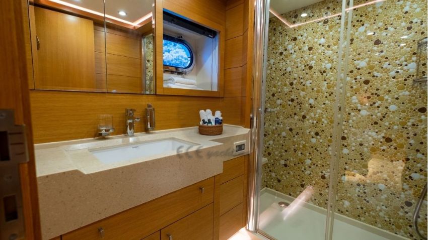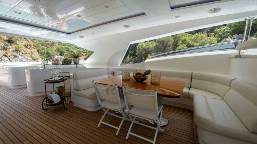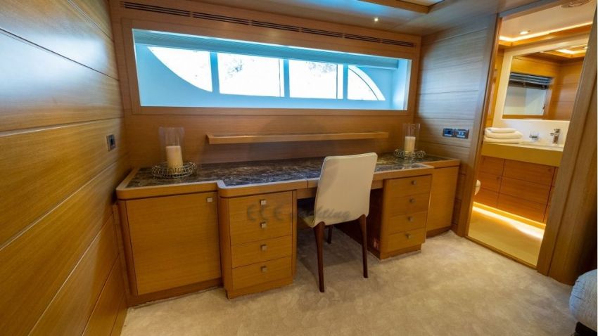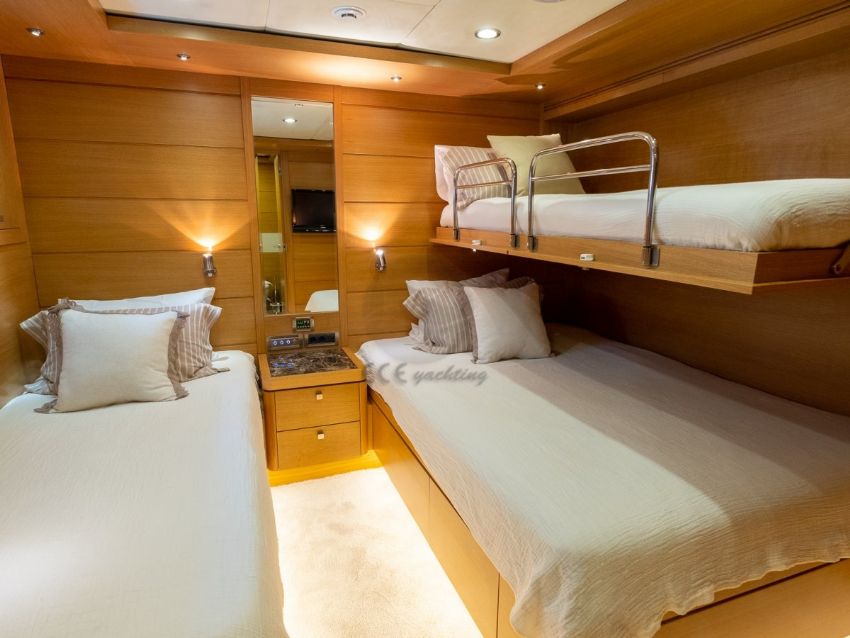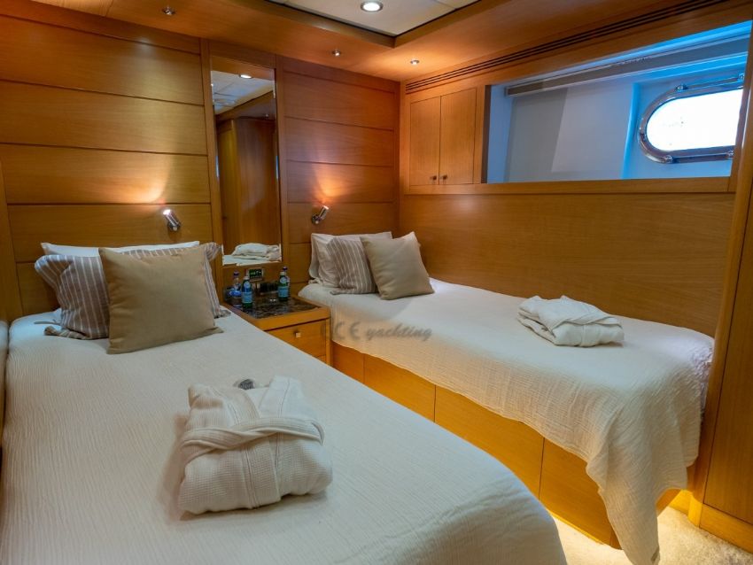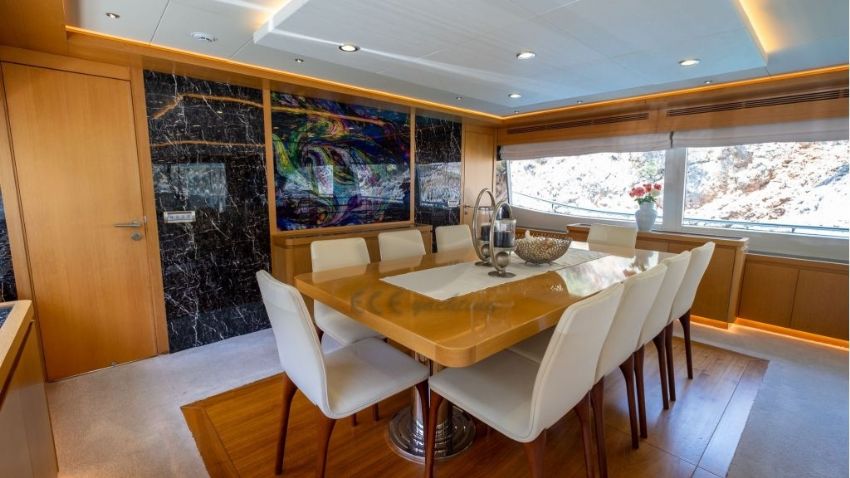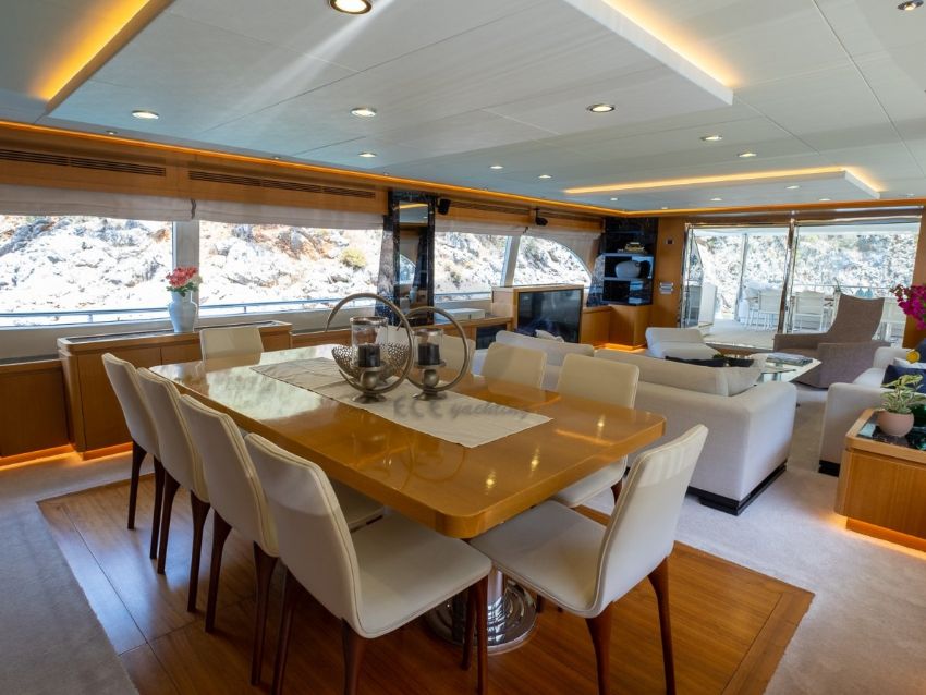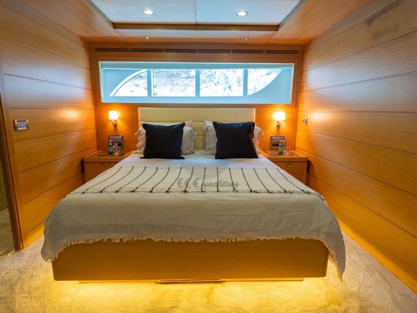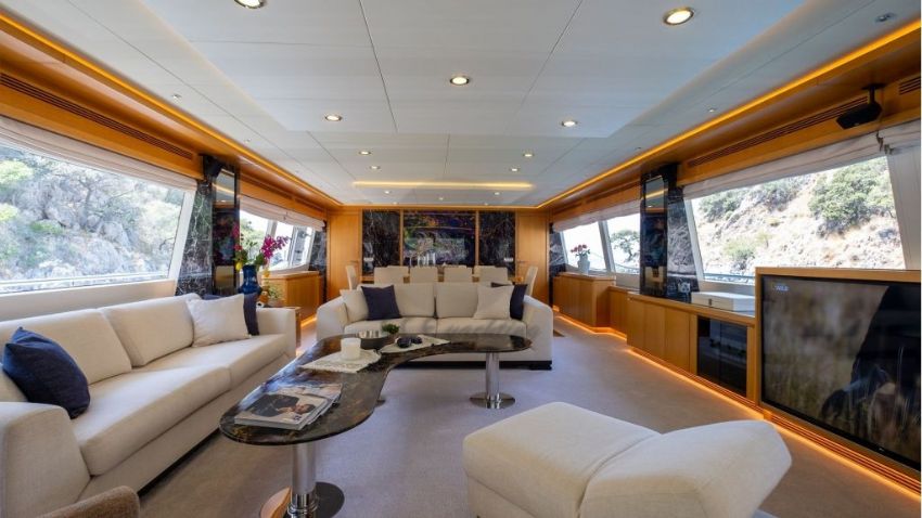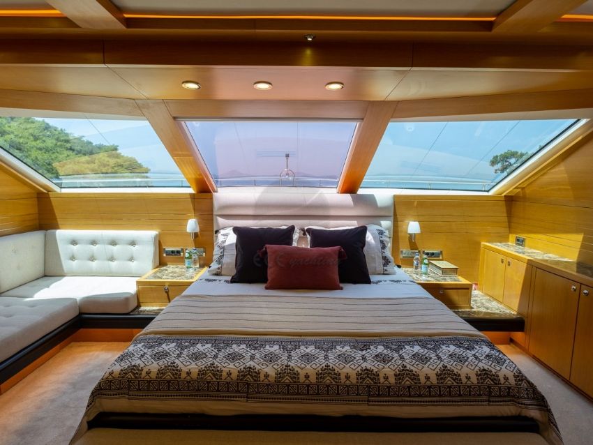 Panfelıss’in iç tasarımı, modern çizgilerle zarif bir atmosfer yaratırken, geniş pencereleri sayesinde doğal ışığın ferahlatıcı etkisini yaşam alanlarına taşır. Yatın ana salonu, konforlu mobilyalar ve şık detaylarla dekore edilmiş olup, misafirlere rahat bir oturma alanı ve geniş bir yemek masası sunar. Tüm yat, her mevsim ideal sıcaklıkta kalmasını sağlayan ileri teknoloji bir klima sistemiyle donatılmıştır. Yatın konuk kapasitesi, beş özel kabinde toplam 12 misafir ağırlayabilecek şekilde tasarlanmıştır. Bu kabinler, bir adet geniş ve lüks master kabin, iki adet şık çift kişilik kabin, bir adet konforlu ikiz kabin ve bir adet triple kabinden oluşur. Her kabin, konukların rahatlığı için özenle döşenmiş olup, modern banyolar ve geniş depolama alanlarıyla donatılmıştır. Ayrıca, yatın altı kişilik deneyimli mürettebatı, misafirlerin ihtiyaçlarını en üst düzeyde karşılamak için hizmet vermektedir.