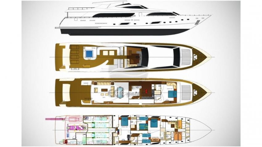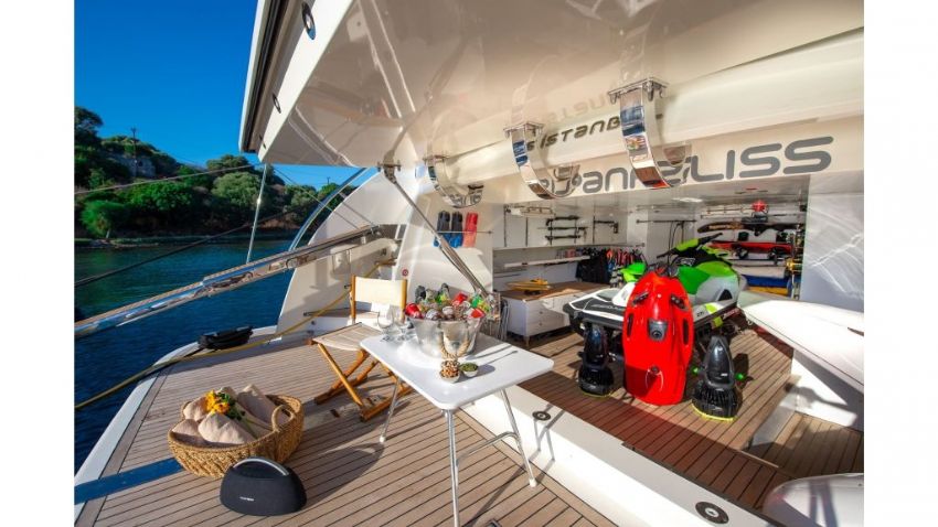 Şnorkel ekipmanları, Balık tutma malzemeleri, Güneş tenteleri, Güneş yatakları, Güvertede duş, Deniz merdiveni
