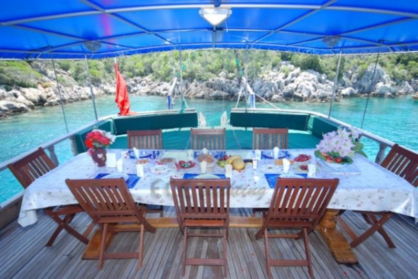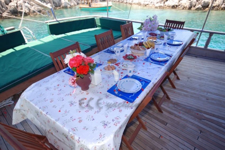 Şnorkel ekipmanları, Balık tutma malzemeleri, Güneş tenteleri, Güneş yatakları, Güvertede duş, Deniz merdiveni