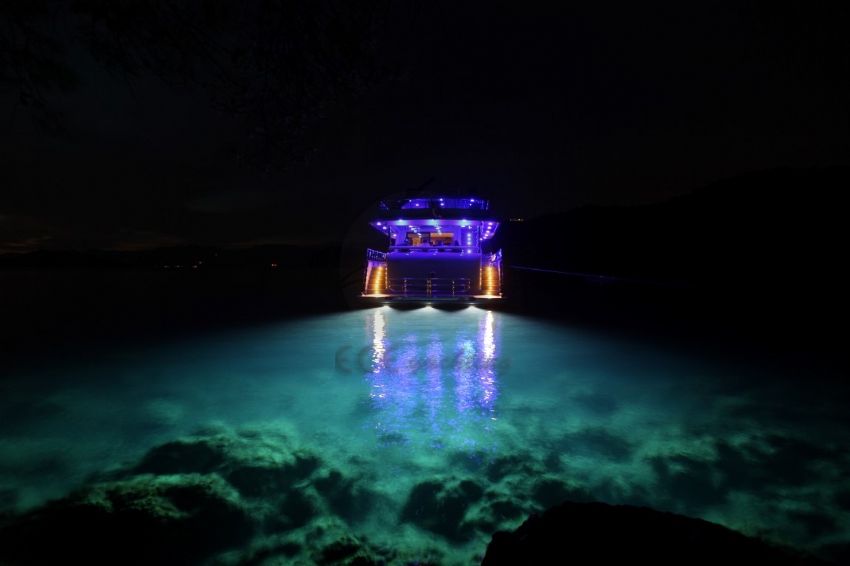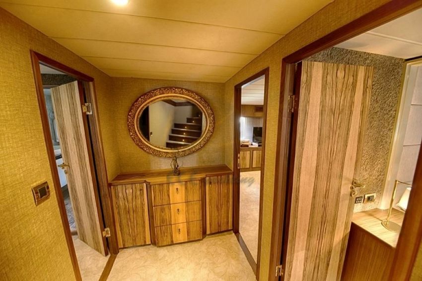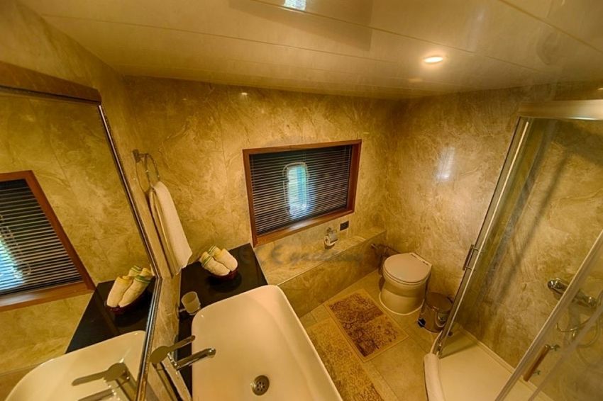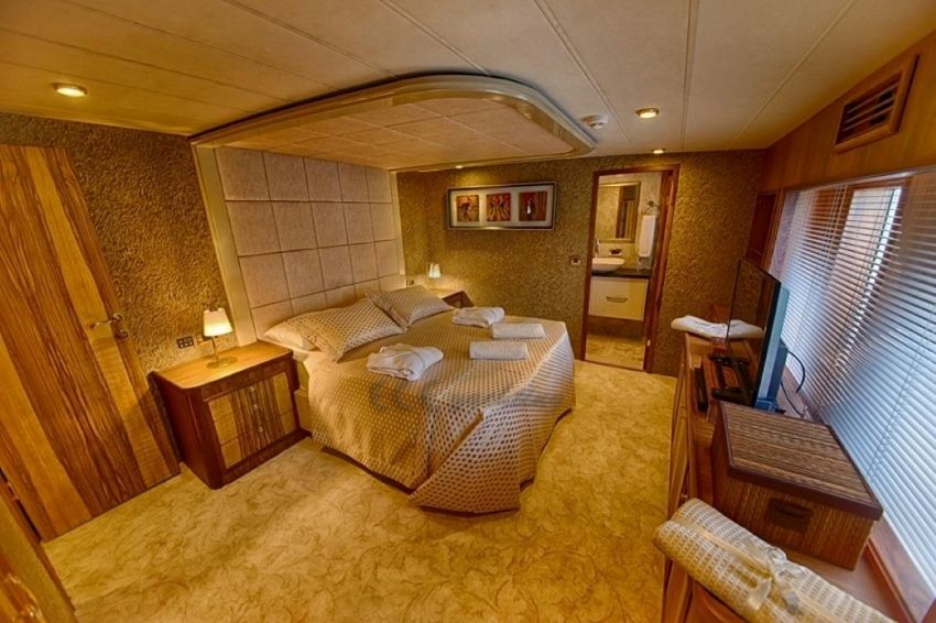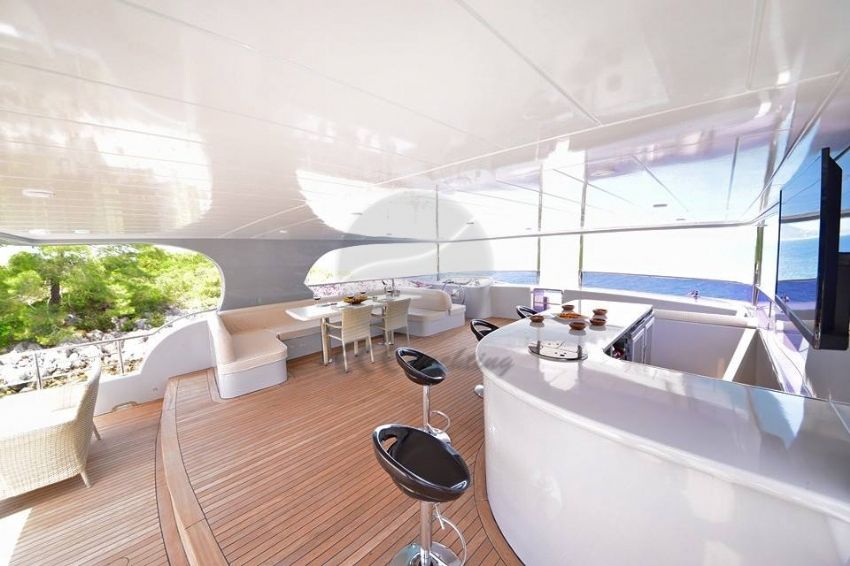 Ultra lüks yatımızda flybridge diye adlandırılan üst güvertede çok şık bir bar mevcuttur. Bu alanda hem rahatça dinlenebileceğiniz oturma grubu, hem de güneşlenebileceğiniz şezlonglar vardır. Ana güvertenin ön bölümünde seyir keyfini tadabileceğiniz bir oturma alanı ve arka güvertede ana yemek masası bulunmaktadır. Ana güvertede salon ve 1 master kamara alt güvertede ise 1 adet master ve 2 adet vip double kamaramız vardır. 3 kamaramızda giyinme odası dahil tüm ayrıntılar düşünülerek inşa edilmiştir. Tam navigasyon ekipmanı bulunan mavi tur yatımız Ege ve Akdeniz'de hizmet verebilmektedir.