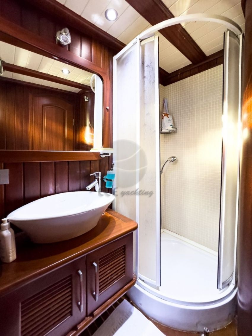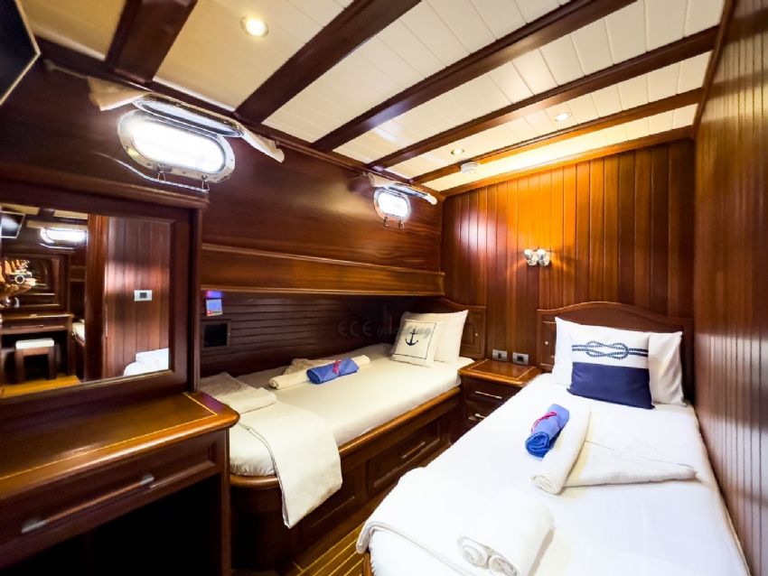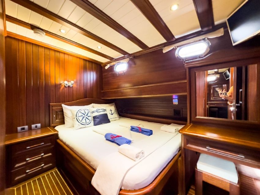 2020 yılında tamamen yenilenen guletimiz, 24 metre boyunda olup 4 adet konforlu kabini ile 8 yolcu kapasitesine sahiptir. Son derece temiz, bakımlı ve konforlu teknemizde özenle seçilmiş 3 mürettebatı ile size özel hizmet verilmektedir. Tüm kabinlerde TV, klima, duş kabinli banyo/tuvaletler; ayrıca her banyoda saç kurutma makinesi mevcuttur.