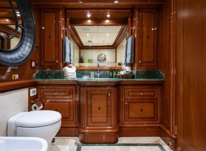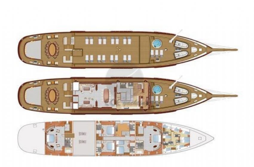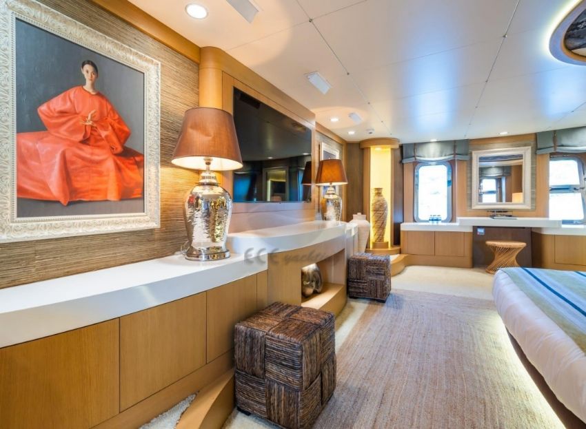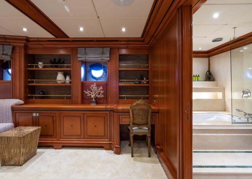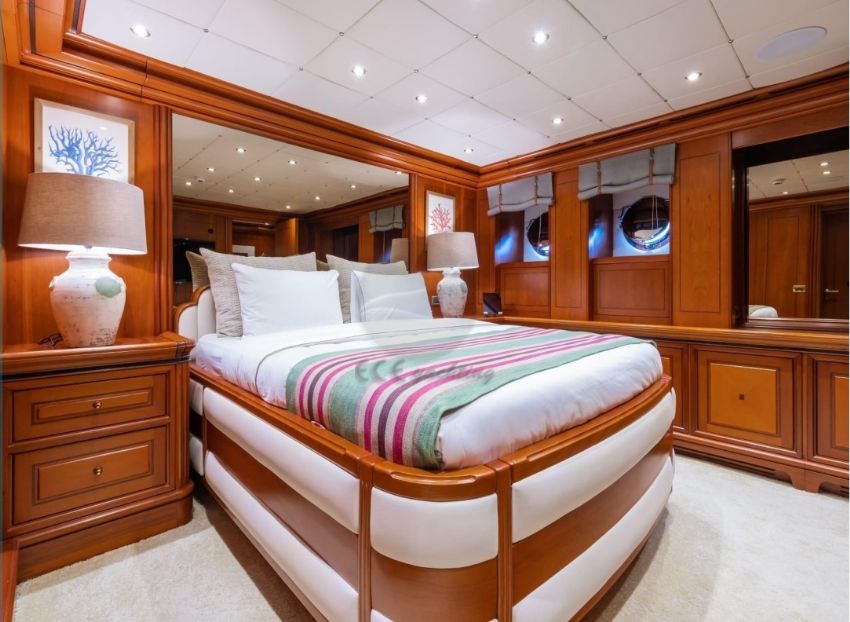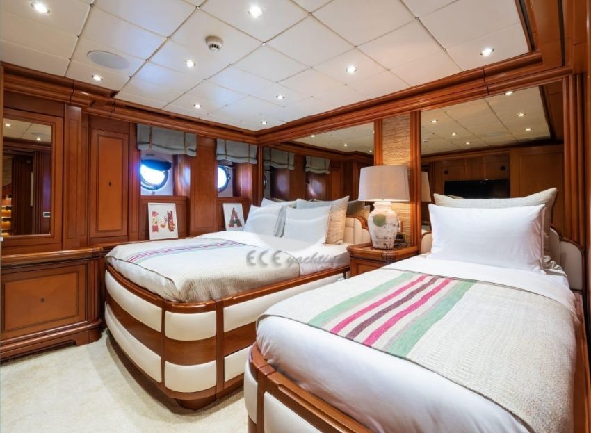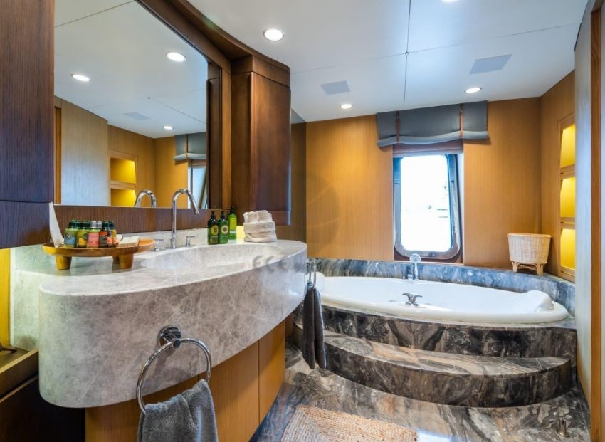 Teknede toplam 5 kabin bulunur: 2 adet master suit, 2 adet double kabin ve 1 adet twin kabin. Özellikle master suitler, deniz manzaralı jakuzileriyle kişisel bir spa deneyimi sunarak huzur ve rahatlama sağlar. Ön güvertedeki açık hava jakuzisi ise gün boyunca misafirlerin keyifli vakit geçirmesi için mükemmel bir alan sunar.